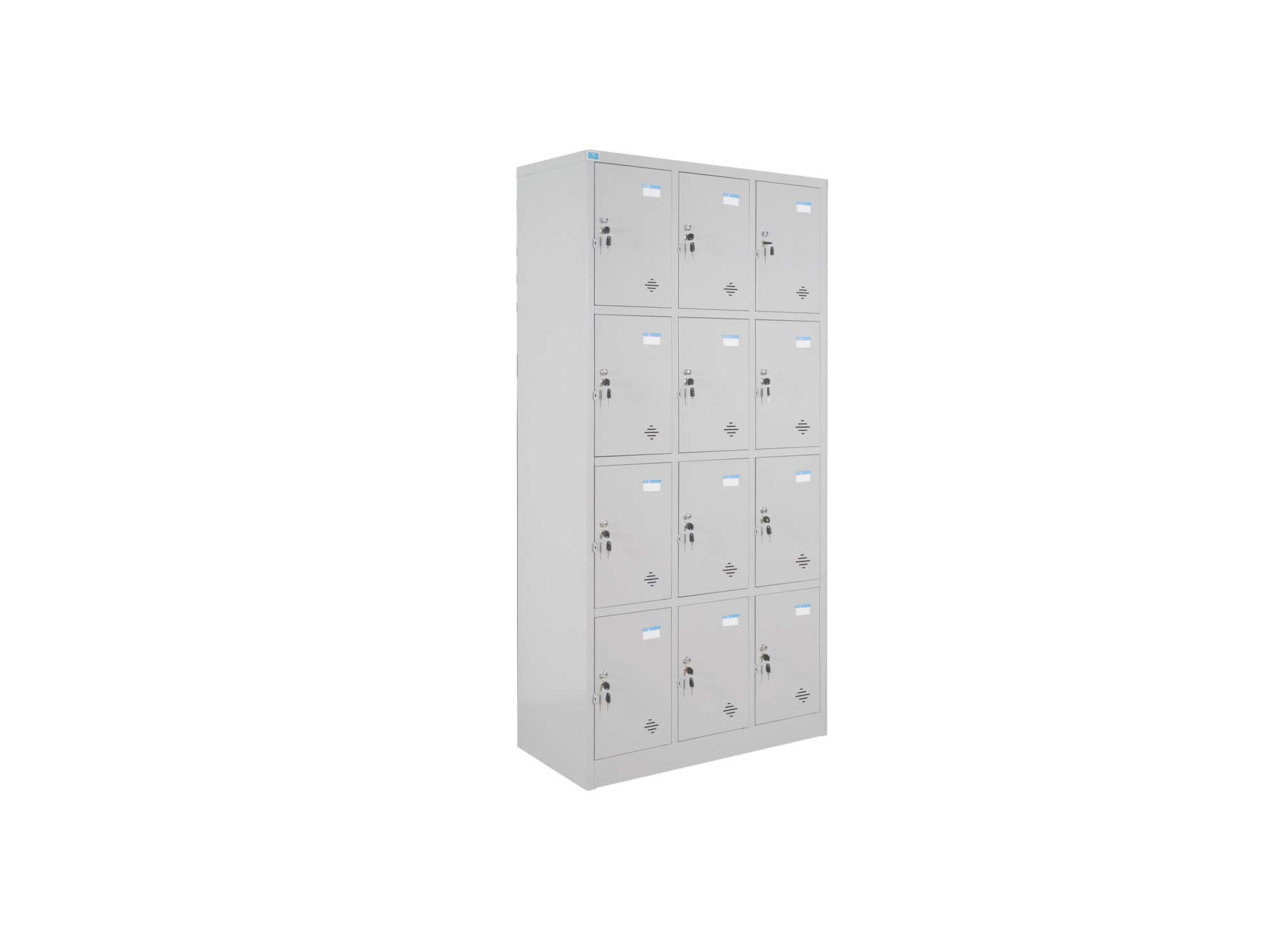Tủ sắt sơn tĩnh điện 12 khoang cánh mở. Trên mỗi cánh có 1 khóa Locker, núm tay nắm và tai khóa móc.